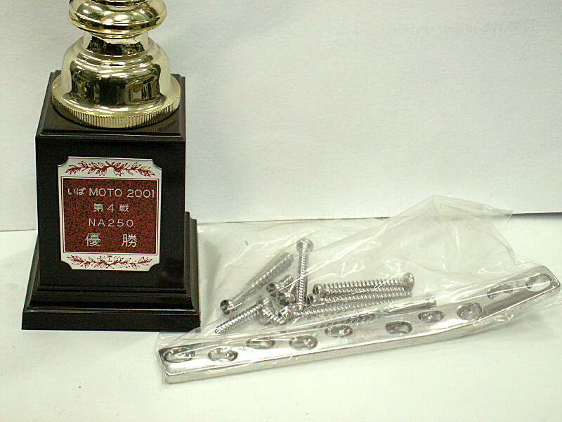 ↑こちらがその時のトロフィーと、その時私の右大腿骨にグリグリとネジ止めされていたプレートです(^^ゞ。
