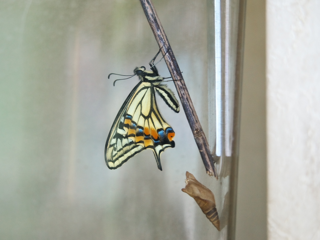 でも、ケースに捕獲しない場合、無事アゲハチョウの成虫になる確率は100分の1程度しかないという話もあるので、苦労してケースに保護して育ててやった甲斐があるというものだし、あんなイモ虫がこんなに美しいアゲハチョウに生まれ変わる様子をこの目で見ることができたのは、素晴らしい貴重な体験だと思う。