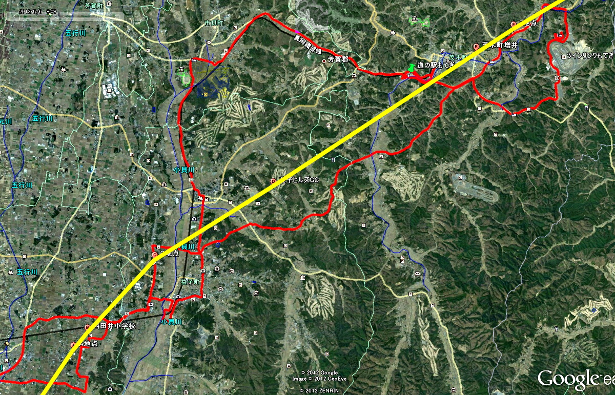 さらに付け加えると、やはり突風の被害があったと報じられた常陸大宮市野田地区は、F地点から約4km先の黄色の線の延長線上に位置している。