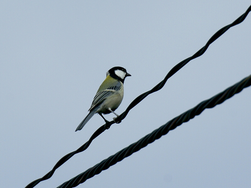 しかし、まだ木々がたくさんの葉っぱをつけているので、カケスを撮ろうとしても暗いし葉っぱが邪魔で撮れずにいると、後ろで聞き覚えのある澄んださえずりが―――。目をやると、電線に「シジュウカラ」がとまっていたのでとりあえず撮影