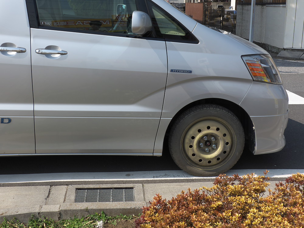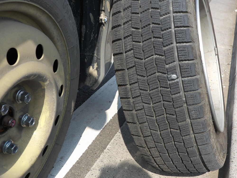 4月から小学生になる孫を船橋の家まで送り届けた翌日、ちょっと出かけようとしたら右前輪がパンクしててぺっちゃんこになっちゃってて、慌ててスペアホイールに付け替えた、というわけです。