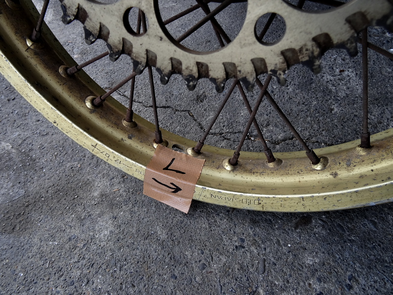 タイヤを外しリムをバラす前に、方向が分かるように印をしておく↓