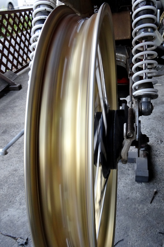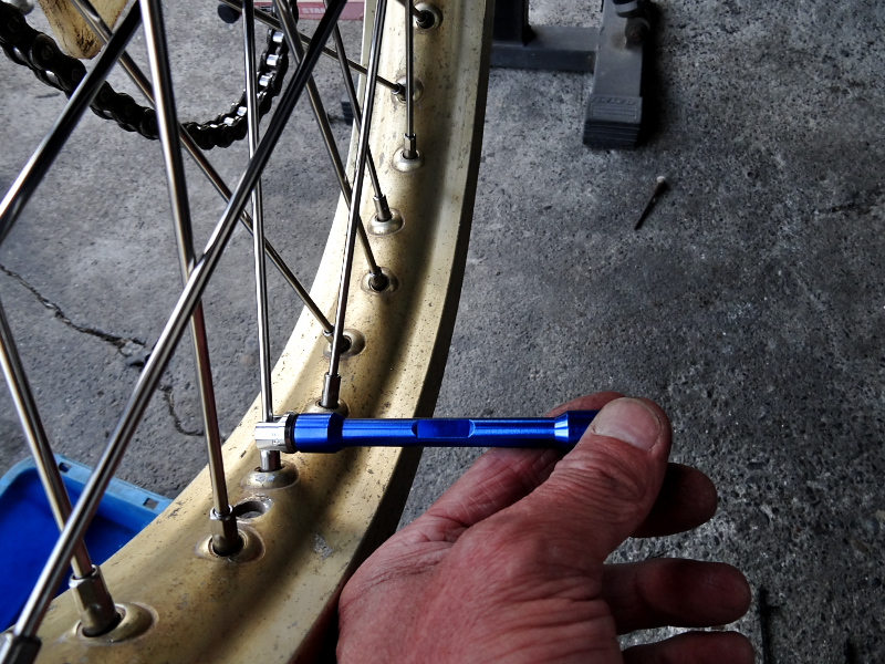 最終的な張りの調整は、チェーンを掛けない状態でスイングアームに組み付けて、バラす前に測った位置で振れがないようにニップルレンチで締め込んで行く。