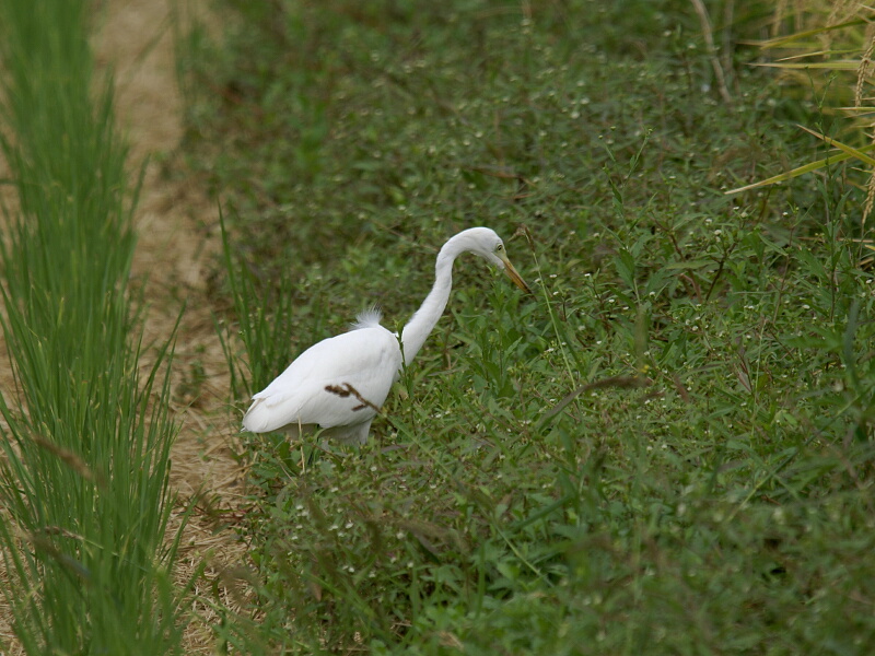 へぇ~、サギ類ってサカナとかオタマジャクシとか「水生動物」しか食べないんだと思ってたら、コオロギみたいな「乾きモノ」(笑)も食べるんだ―――と思い調べてみると、ダイサギのエサはサカナ、カエル、ザリガニなど。そしてチュウサギは「カエルやトカゲなどのほか、魚類や昆虫類も獲る」とのこと。