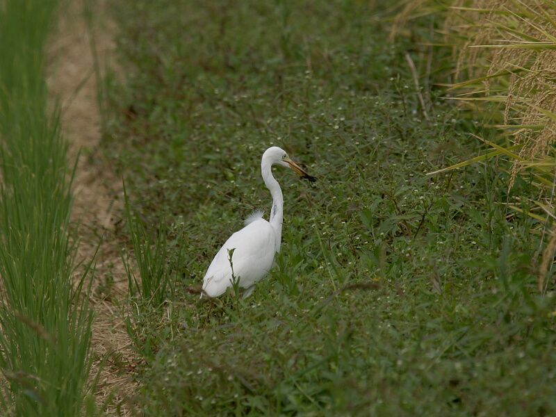 でも、チュウサギの方はあまり見かけないという話なので、たぶんダイサギだろう‥‥‥と思っていたら、一瞬目にも止まらぬ速さで頭を動かし、地面から何かをくわえ上げたようだ↓。