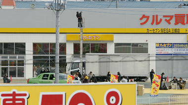 きょうの朝、荷物を配達に来た佐川の兄ちゃんが「トーサイ(TWK横の中古車屋の旧称)で芸能人が来てなんか撮影やってるっスねぇ」というので、あまり興味はないけどどんな事やってんのか屋上から盗撮してみることにした。