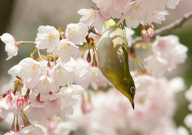↑園内に一本だけある「ヒガンザクラ」(だと思う)と「メジロ」。