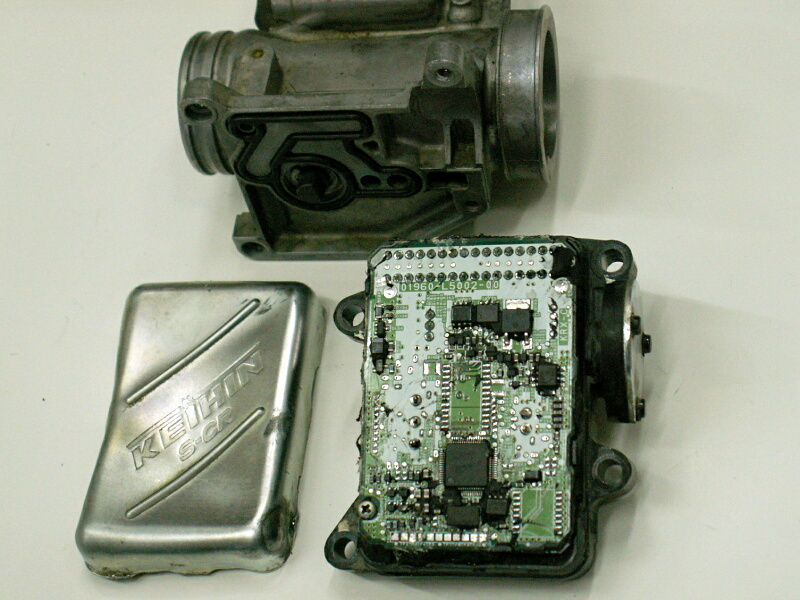 パーツとしては完全な「ブラックボックス」状態で、薄い鉄板のカバーは取り外すことができない構造になっているが、もうこのイカれてると思われる部品は使わないので“子供の頃買ってもらったオモチャを元に戻せないのにバラしてしまう”という悪い癖があったこの私、童心に帰って(?)好奇心を満たすためバラさせていただいたのだが、シリコンが充填されくっついていたカバーを無理やりはがすと、その中は見てもチンプンカンプンの「今どきの電子機器」状態。これじゃあバラしてみてもどこが悪いのか判りっこないし、アッセンブリー交換しか方法はないやね(ーー;)。