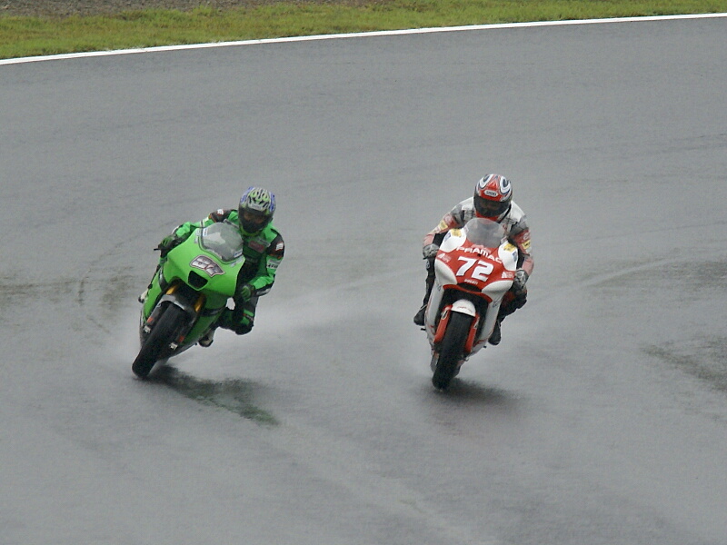 柳川選手は5年前の2002年、KawasakiがMotoGPクラスに参戦を始め、このもてぎで4スト990ccのニューマシンをデビューさせた時にそのプロトタイプマシンを駆って出場したのですが―――