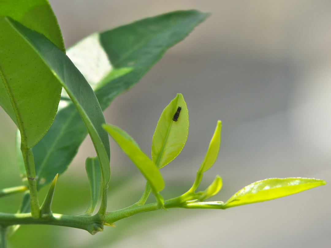 ↑アゲハチョウが柚子の葉っぱ、それも新芽を選んで産み付けていった卵は、何日かすると孵化して小さい小さい幼虫(長さ2~3mm?)になります。