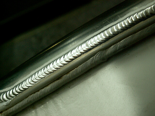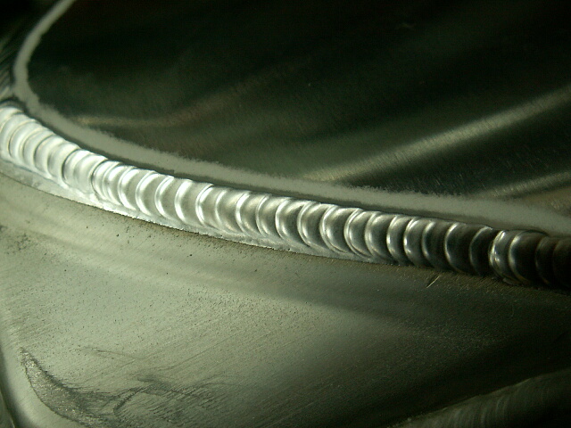 おまけに、美しい溶接のためには溶接トーチのタングステン電極(わかりやすく言うと溶接火花が出るところ)とアルミ母材の間隔は、接触するギリギリくらい近い方がいいんだけど、もし誤って接触させてしまうとビードが乱れるだけでなくその周囲が黒ずんでしまい、見た目の印象はガタ落ちになってしまうのです‥‥‥。
