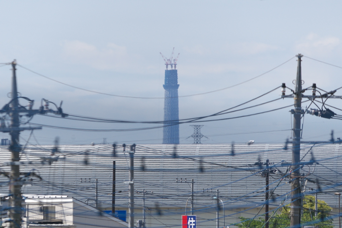 TWKからだと常に逆光だし、手前に写っている外環道のシェルター上の陽炎の影響でいつもピンボケ状態(ーー;)。