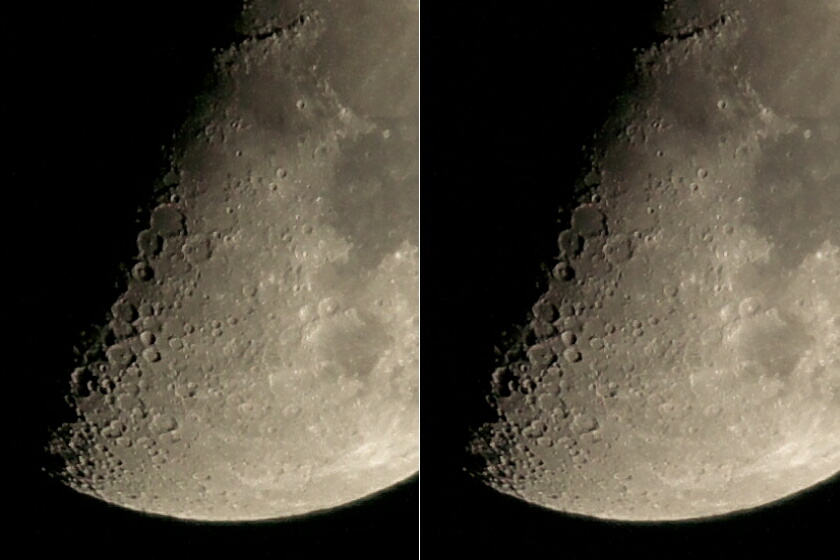 で、この画像を見ていたら、今マイブームになっている「ステレオグラム」に加工できないだろうかと思ったが、無限遠方にある月をちょっと位置を変えて撮ったところで何も変わらないので、画像加工ソフトでちょっといじくって作ってみたのがコレだが―――↓