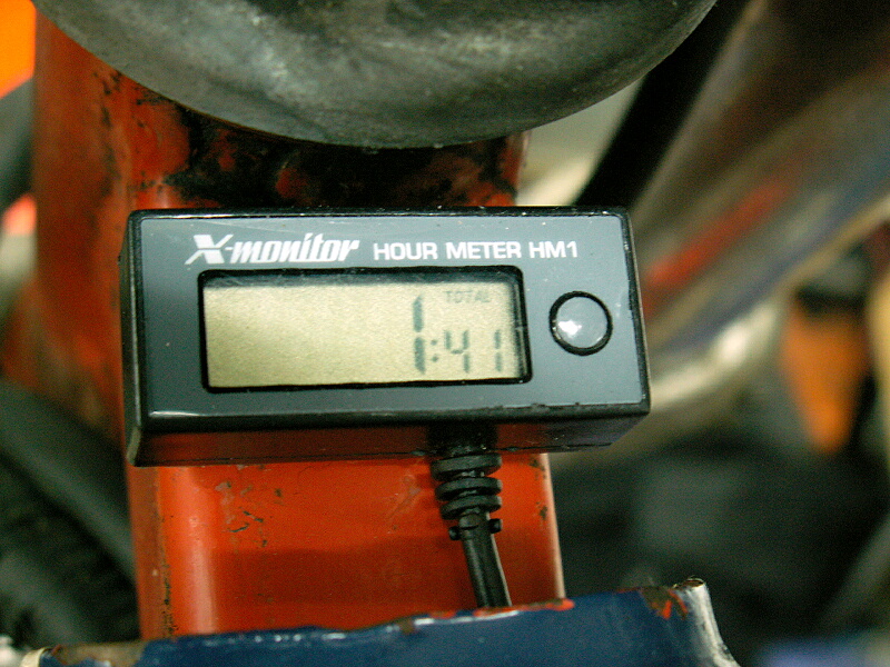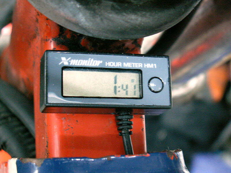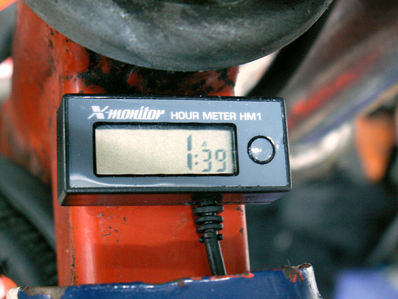 簡単に言うと、プラグコードにセンサーを巻きつけてエンジンがかかっている時間を計測する装置ですが、エンジンオイル交換の時期やピストン等消耗パーツの交換の目安を知るために大変重宝するだけでなく、その日走行した時間が計測できるので、どのくらい練習したかが「感覚」ではなく「数値」として客観的に表示されるのだ。