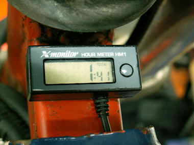 このアワーメータ、便利なことにA、B、そしてTOTALの3モードの積算時間が表示され、それぞれボタンひとつで簡単にリセットできるので、たとえばAモードで1日の走行時間、Bモードはオイル交換してからの走行時間‥‥‥といった具合に使い分けることができる。