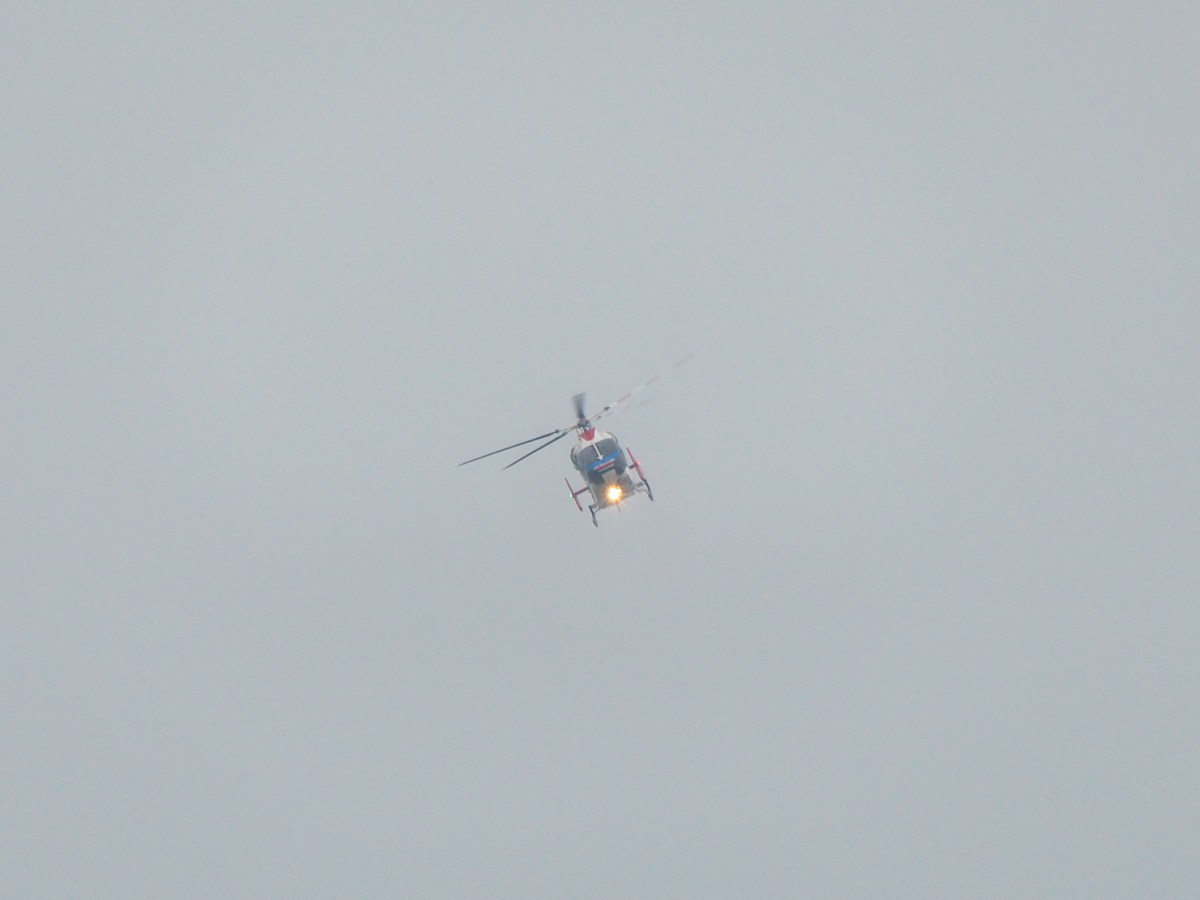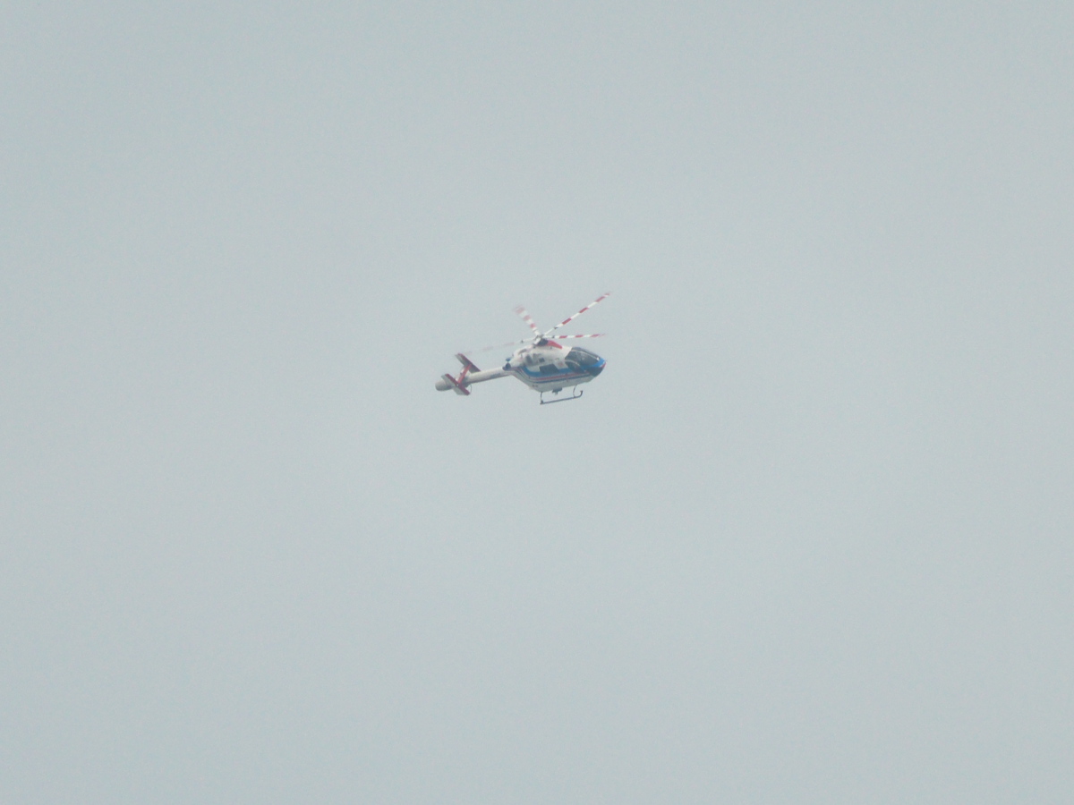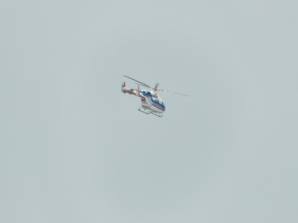 そういえば、昨日の朝いつものように屋上でエアバンドを傍受しながら運動していたら、TBSのナナロク(JA06HD)や日テレの430(JA02AX)が中央道・八王子付近や東名・厚木付近の渋滞を撮りに飛んでいる様子が聴き取れたが、そんな「顔なじみ」のTV局報道ヘリとはまたちょっと“生息域”の異なるこのヘリがTWK上空に現れた↓