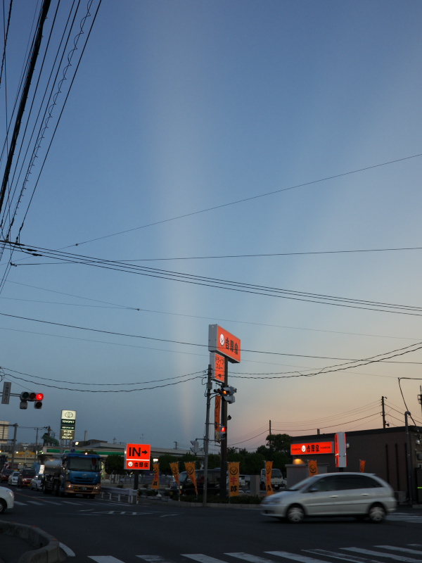 夕日は反対側にあるのでちょっと不思議な光景ですが、実はこれ、日没前に西の空に出ていた雷雲の切れ間から差し込んだ光の筋が、東の空までまっすぐ貫通したものなんですね。
