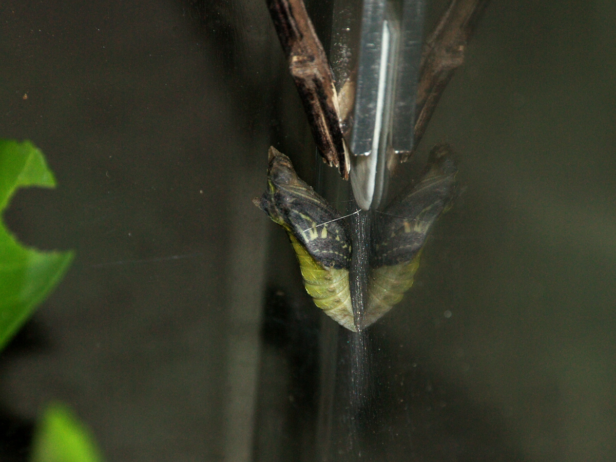 ネット上の飼育日記等を見ていると、蛹ってから羽化までの期間は10日~2週間くらいのようなので(蛹る期間の日数については、きちっと書いてある例があまり見当たらなかった)、まだまだ羽化は先だろう。