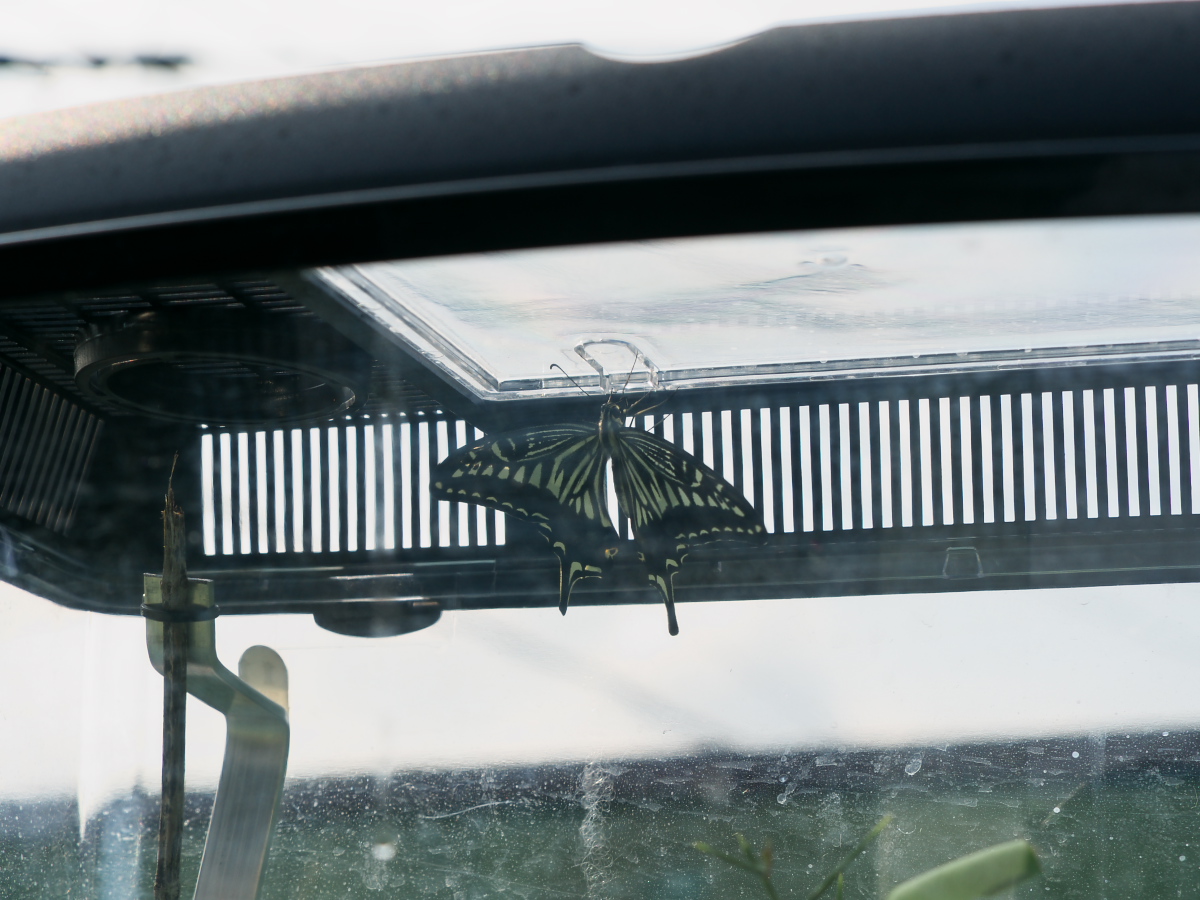 結局眠りについたのは午前3時近く。そしてきょうの朝8時半に起きて真っ先に飼育ケースを見に行くと、そこにはすでに羽がきれいに広がって、狭いケースの中を飛び回るアゲハチョウの姿があったのでした(@_@;)。