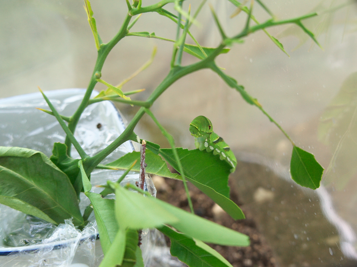 ―――というわけで、初めてのアゲハ幼虫の飼育はみごと大成功!!本当なら綺麗なアゲハに生まれ変わった姿をゆっくり眺めて、写真もいっぱい撮って感激に浸りたかったのですが、とにかく早く外に出してやらないとと思い焦ってドタバタしてしまい、とても感激に浸ってる余裕なんてありませんでした(ーー;)。