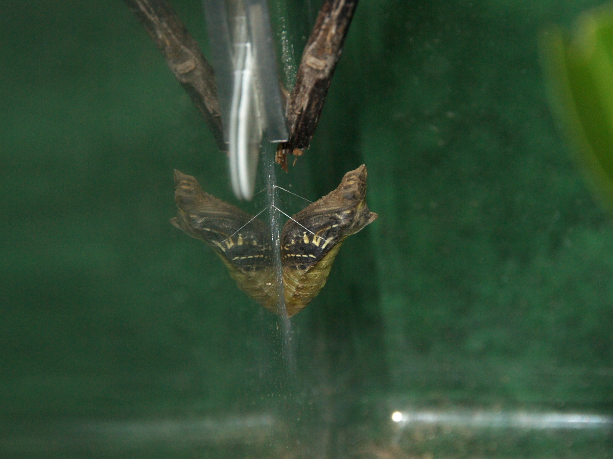 そして8月27日の朝、最初に蛹った(笑)「1号くん」がみごと成虫に羽化!!初めての経験で感動を味わったのですが、その1号くんの1日遅れで蛹った「2号くん」、予定では28日の朝に羽化かと思ってたのに前日の夜見ても変化なし。