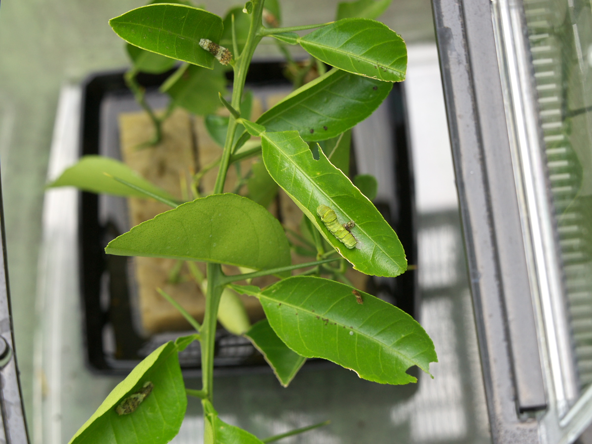 で、ネットで調べるとアゲハチョウが卵から無事成虫になれる確率はわずか1~2%という記述が多く見られ(真偽のほどは不明だが)、これは保護するしかないでしょ!?!?ということで“イモちゃん”を飼育ケースで飼い始めたというワケです。