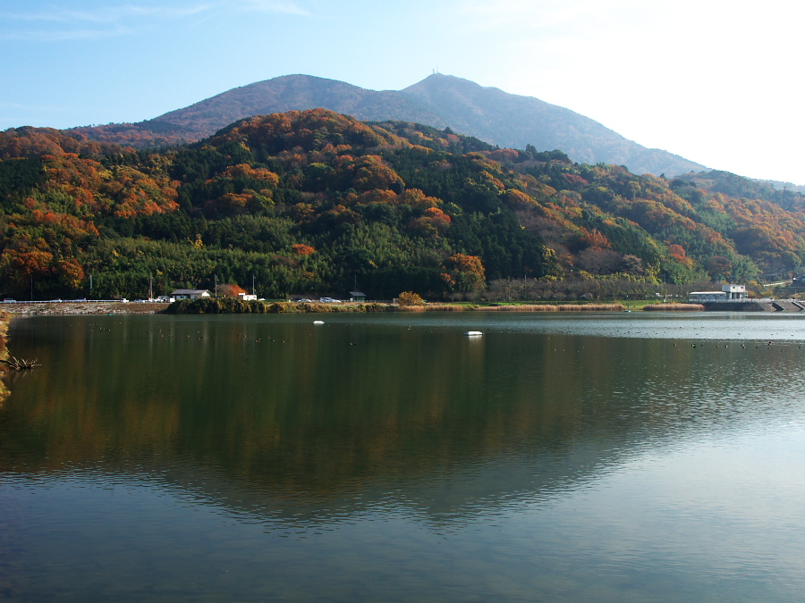 そんなわけで、ランドに行く前に「筑紫湖」に寄り道して、湖面に映る紅葉の「逆さ筑波」を撮ってみました↓