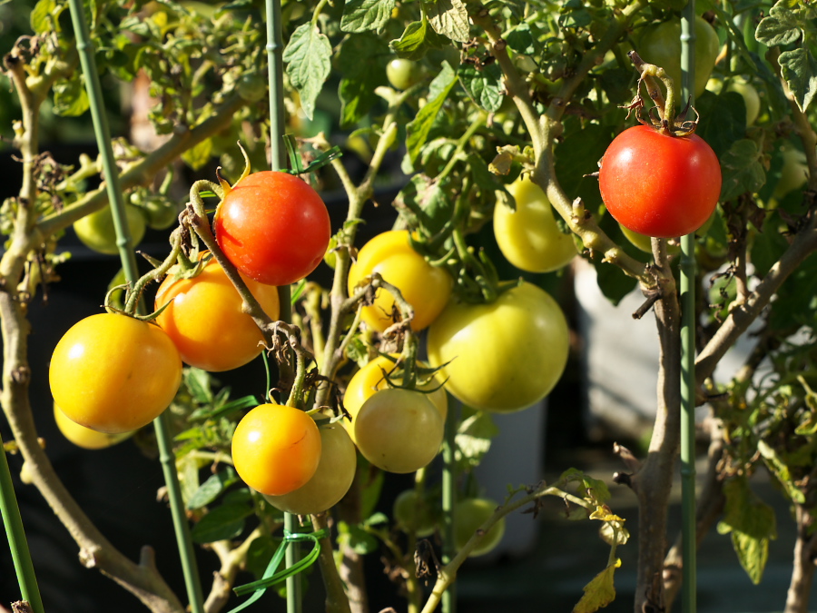 トマトの「凛々子」(←私が勝手に名前をつけてるんじゃないよ、そういう種類なんだって)もたくさん実をつけて、いい感じに熟れて「食べ頃」かな???
