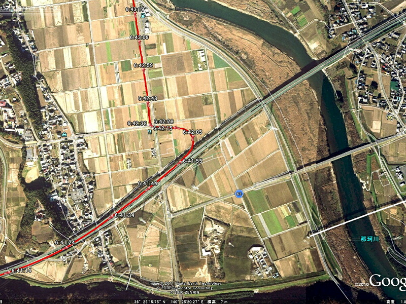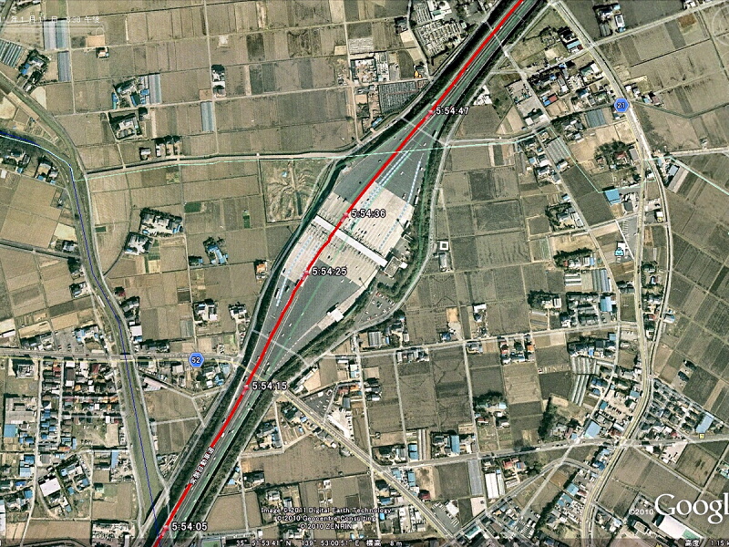 ↑GPSレーダー探知機のドライブルートログをGoogleEarthに取り込んだ画像を見ると5時54分に三郷料金所のETCゲートを通過。あと6分の余裕を残して半額適用に成功(^^)v。