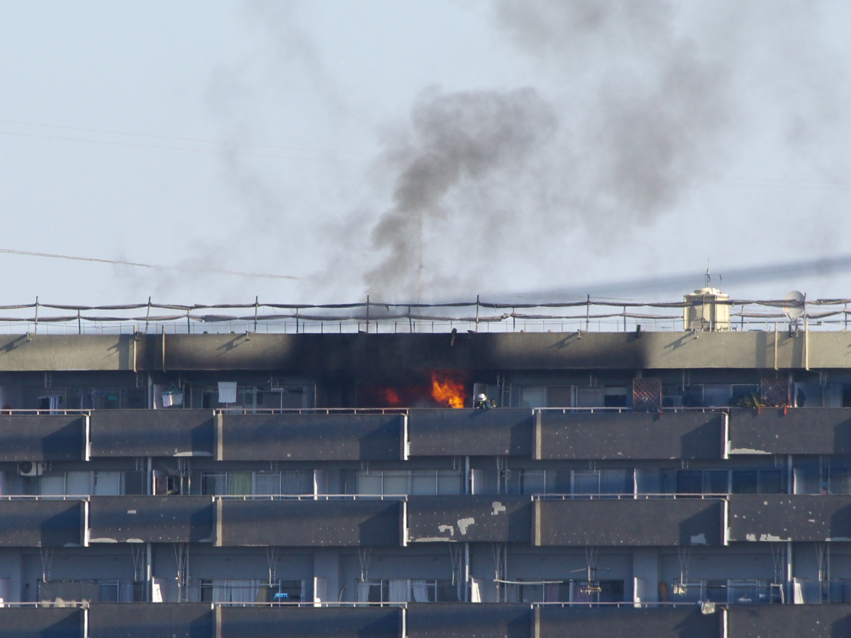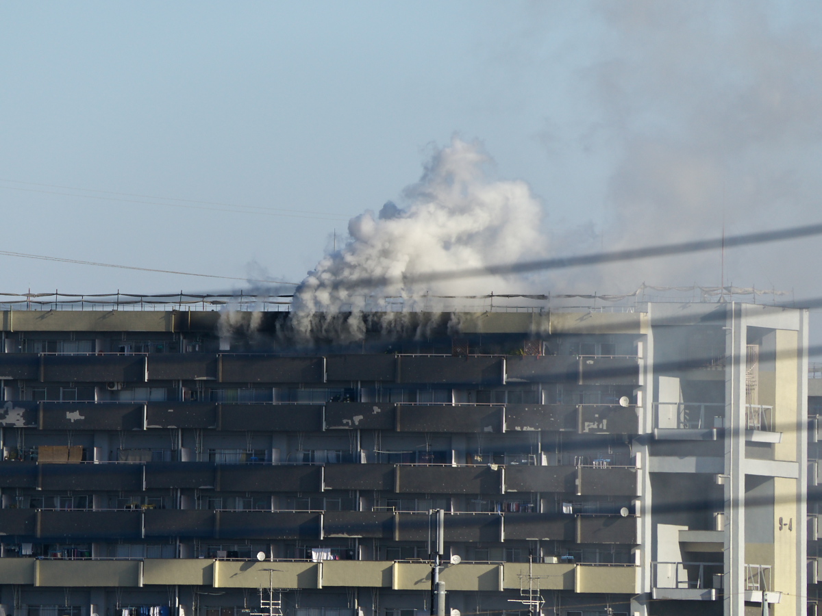 TWKの北北東に見える三郷団地の最上階から煙が(@_@;)。火事だ!!