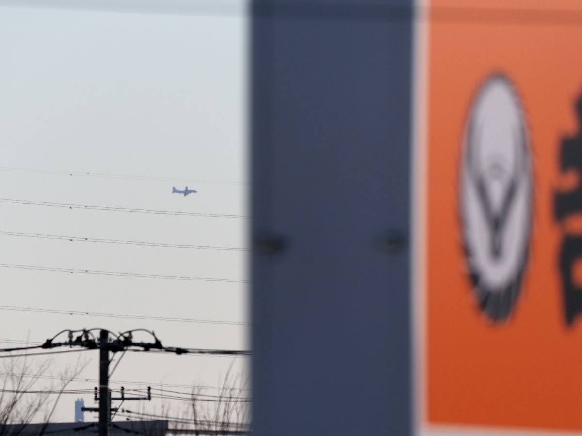 TWK屋上から見ると吉野家の看板のはるか向こうにある下総基地でタッチアンドゴートレーニングをするYS-11TA。