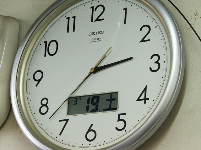 ↑TWK店内の電波掛け時計。電波を受信して正確な時刻を表示している時には、液晶表示の「3月」の下部分にアンテナのようなマークが表示されるのだが、あの大震災以降その表示が消えて、ただのクォーツ時計に成り下がっている。