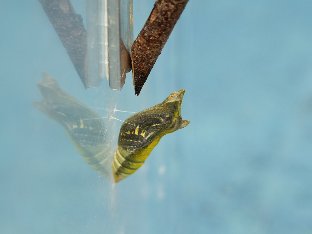 TWK屋上の柚子の木に今年もアゲハチョウがたくさんの卵を産みに来てくれているので、「蛹る大捜査線」シリーズを今年もやってます。