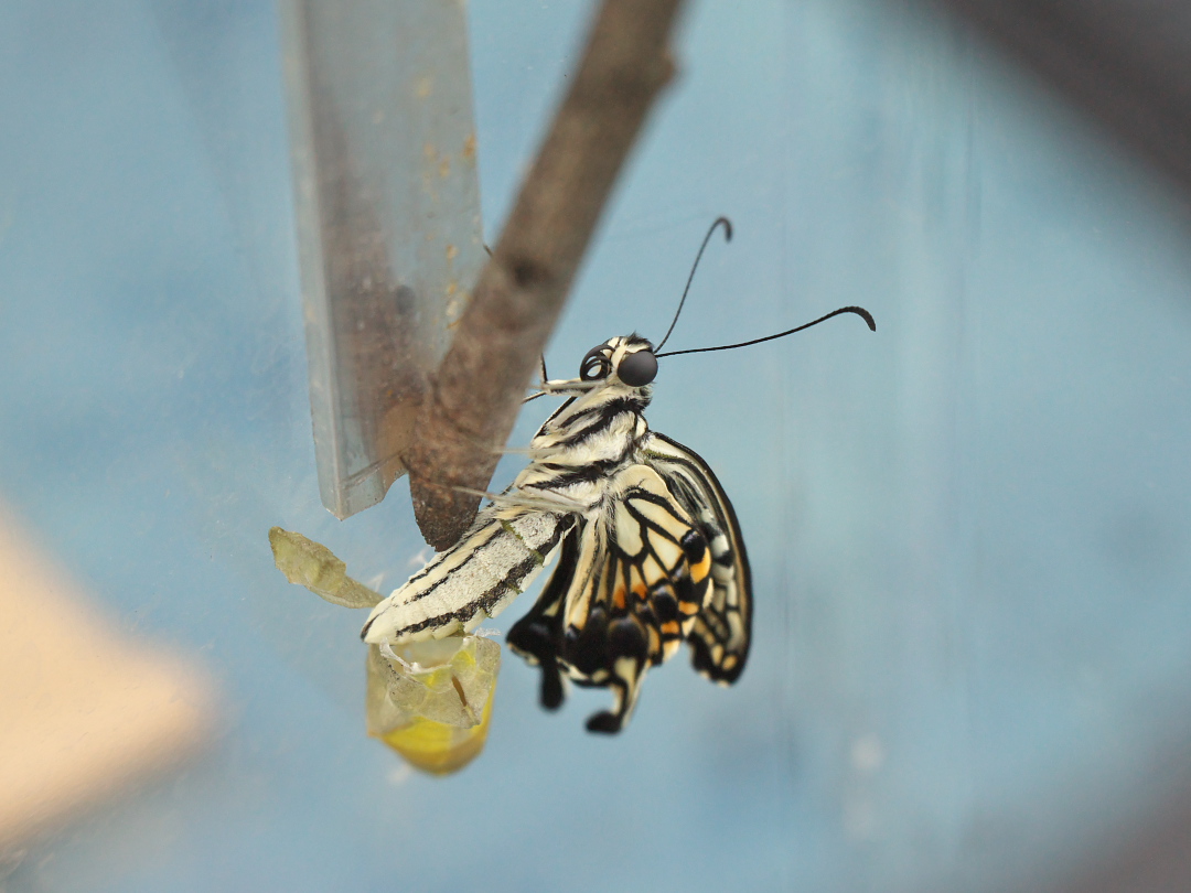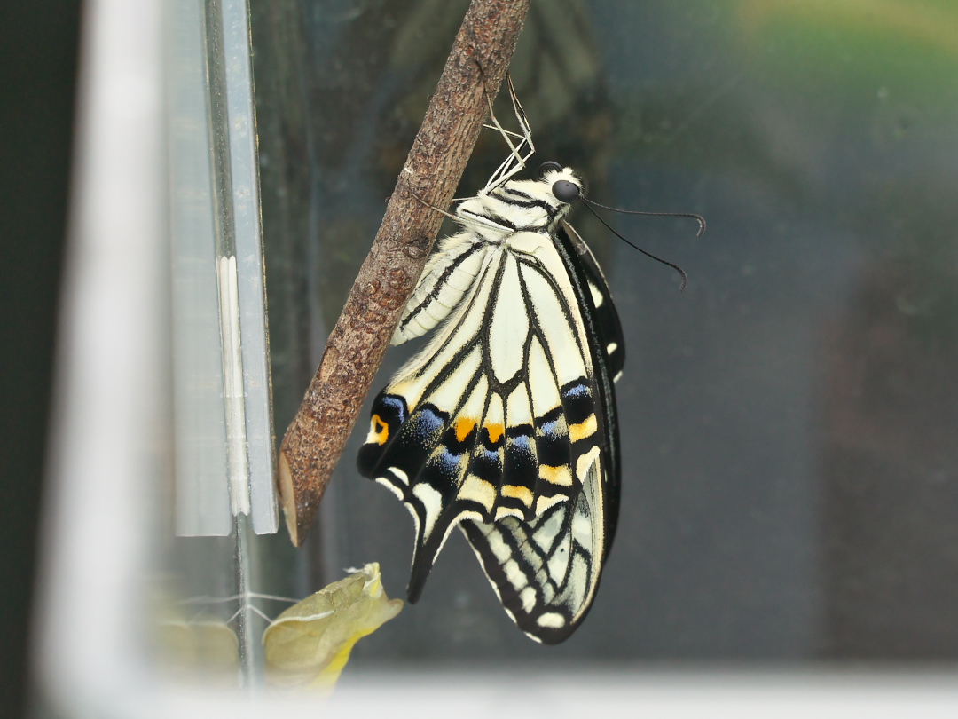 今、TWK屋上の「プチ里山化計画」が着々と進行中で、草花の手入れややって来ている生き物のチェックとかしているうちに羽化しちゃって、蛹から抜け出す瞬間を見逃してしまったのはとても残念だったけど、今年の1号は今までで一番大きくて立派なアゲハチョウに生まれ変わりました!!
