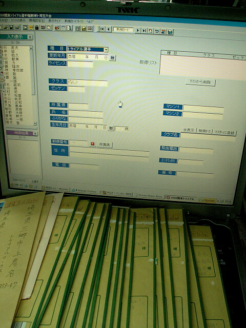 一通一通封を開けて内容を確認、トライアル大会集計ソフトにデータを入力する仕事。これが終わって、ようやく風呂に入って眠ることができる。