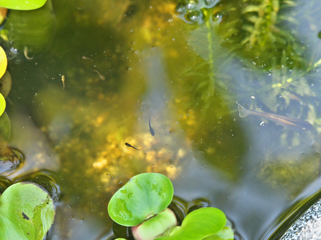 じつはこの池以外の草木に、いろんな昆虫の幼虫が棲み付いていて、そこで「食物連鎖」も展開していたりして、自然のすごさを実感させられています。