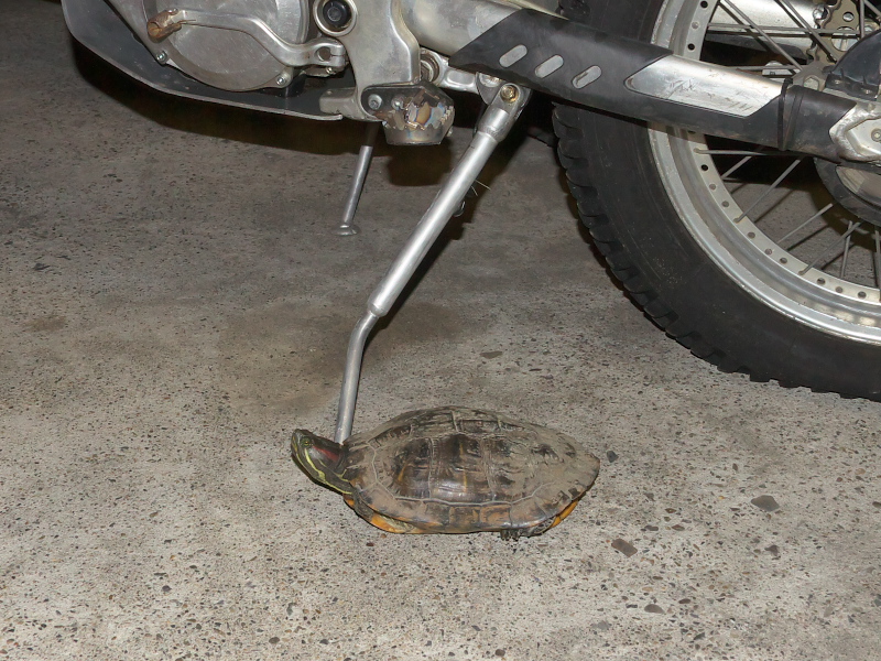 このカメくん、TWK横を流れる二郷半用水路でたまに見かけるが、たぶん数日前のゲリラ豪雨で水位が上がった際に道に這い出して、TWK店内に入り込んだのだろう。
