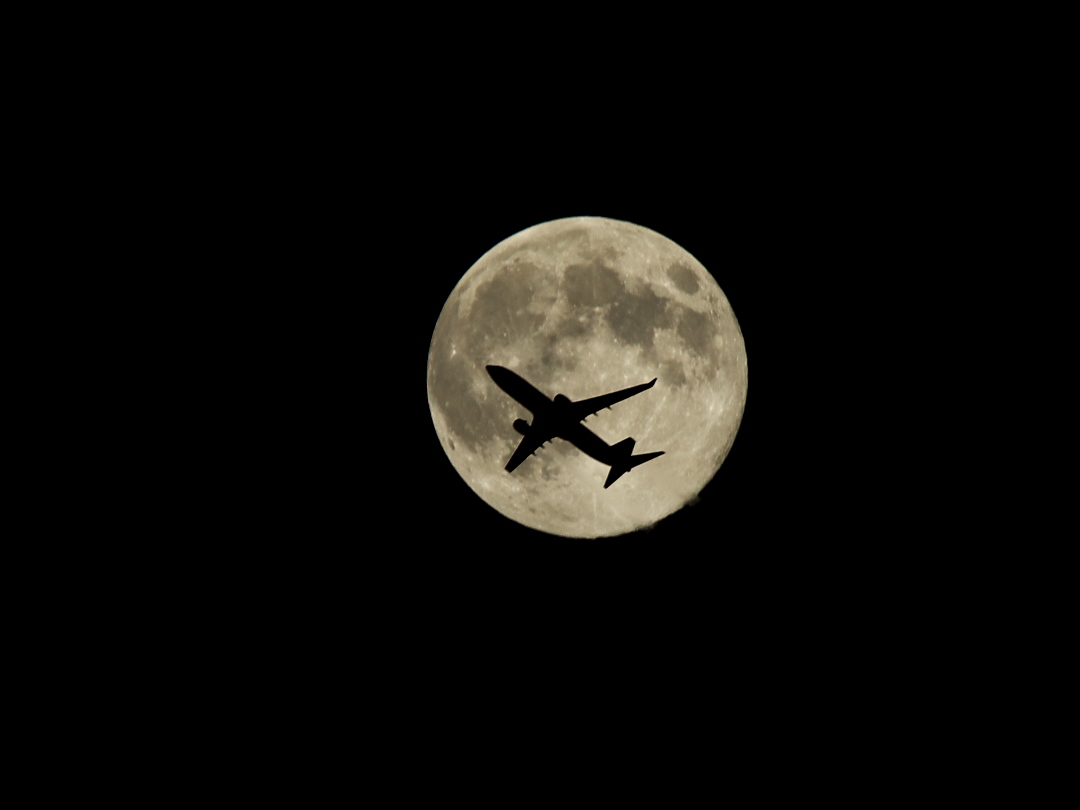 こんなショットが撮れたらいいけど、月の位置とヒコーキのコース、それにシャッターのタイミングがすべて一致することなんて奇跡に近い、と思ってたのに、ほとんど“ムダ打ち”なしでほぼ一発で撮れてしまうなんて――― 前回の夕暮れのショットと合わせ、もう完全に運を使い果たしてしまったねコリャ(^^ゞ。