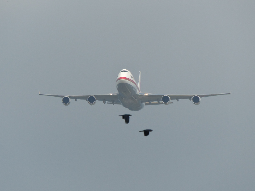 ↑カラスに前を横切られる政府専用機。