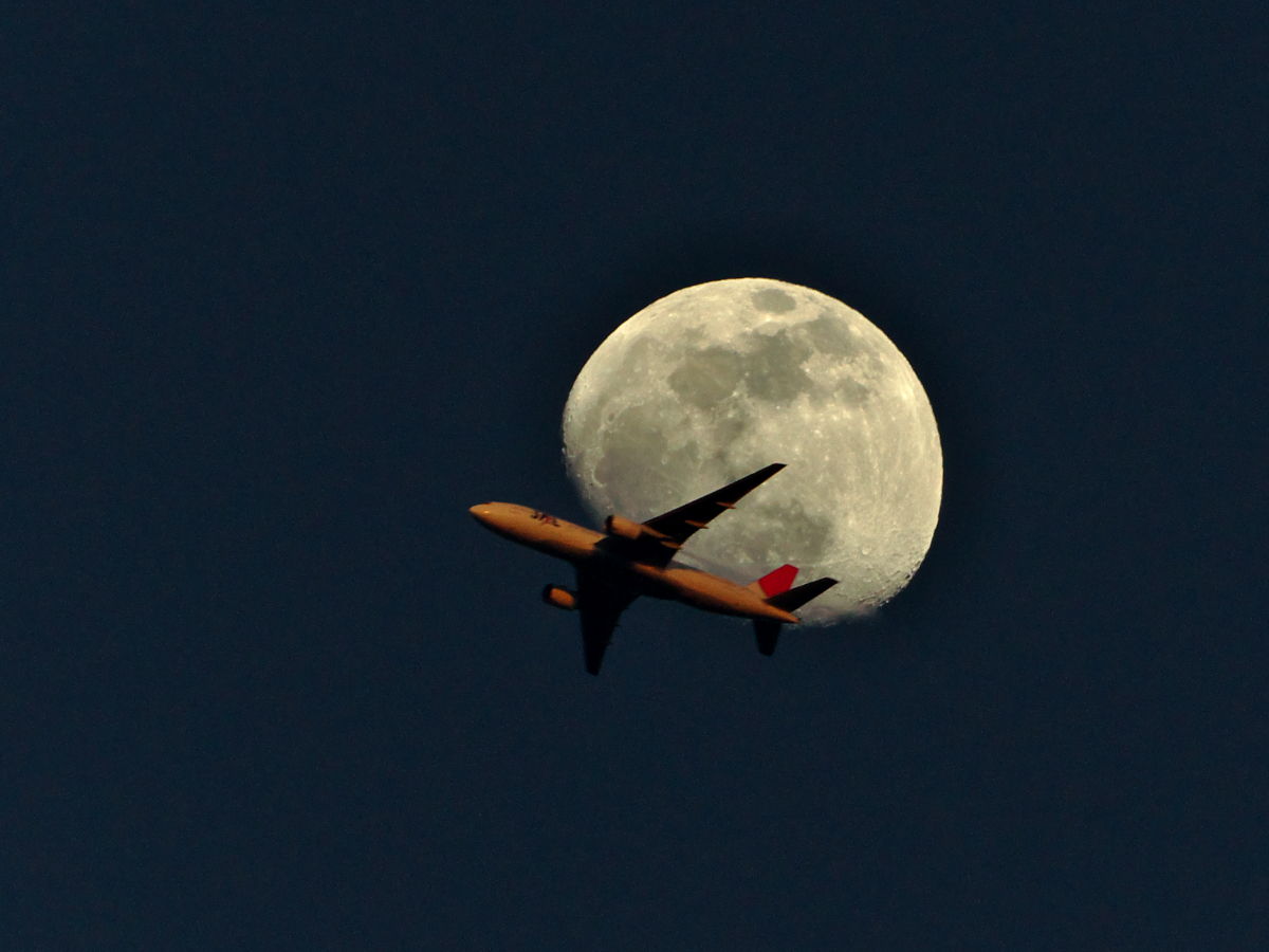 中秋の名月にヒコーキが重なったショットを撮って、「運を使い果たした」とか思ったりもしたけど、実はしょっちゅう月とヒコーキは重なっていて、その後も何枚も撮れてしまっています(^_^)v。