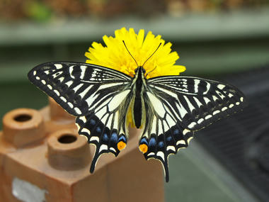 その数時間後にはもう飛べそうだったので、ちょうど屋上に咲いていたタンポポの花につかまらせて飼育ケースから出してあげた。