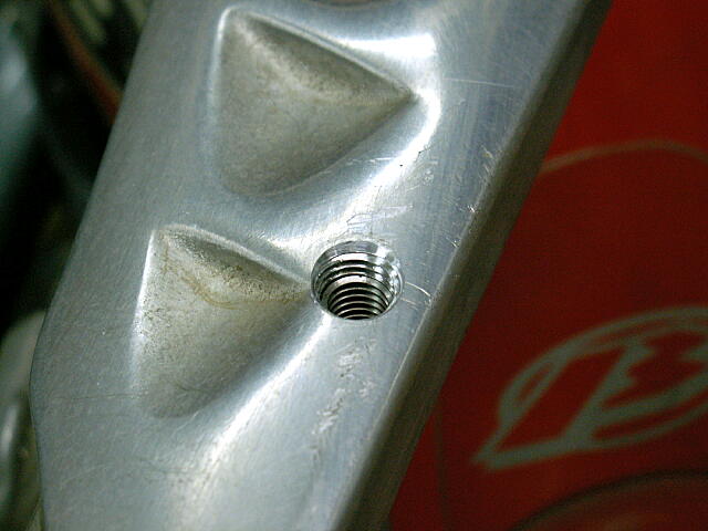 リアフレームにM8のネジ穴を加工したのだが、アルミで肉厚が4~5mm程度しかないので、そのままでは大きな固定力が必要なM8ネジ穴の新設は無理。