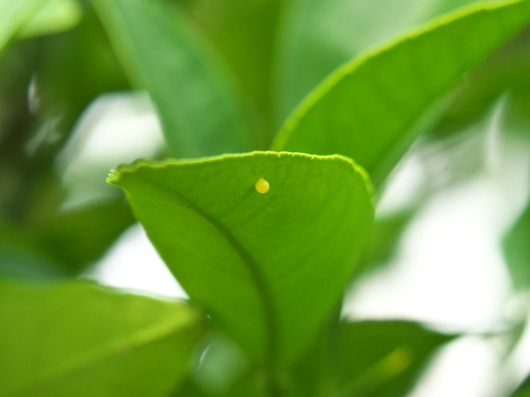 アゲハチョウの卵は直径1mmくらい。何日かすると孵化して幼虫になるんだけど‥‥‥ほとんどは他の生きものの「エサ」になってしまうんですねぇ(ーー;)。