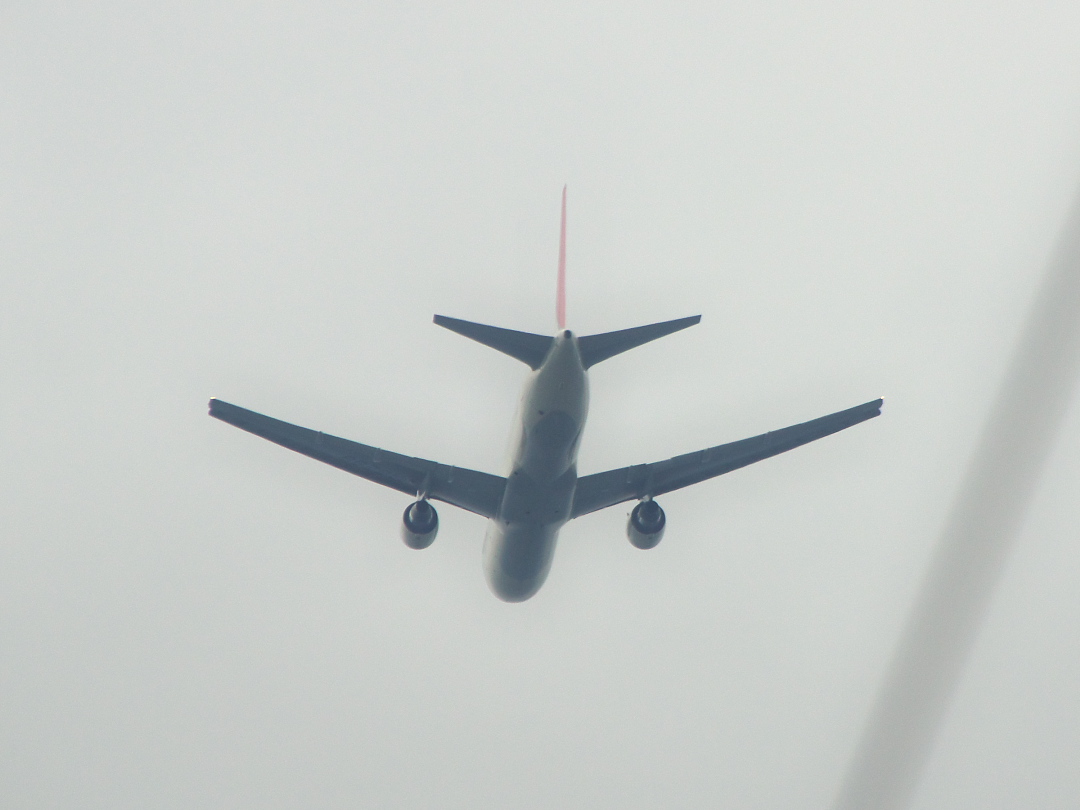 ここ数日は梅雨らしい天気で‥‥‥なんて言うと、豪雨で被害が出ている地域もあるのに不謹慎で申し訳ないのですが、つい先日TWK上空のどんよりした雲の下を低空で飛行するJAL機を見かけ、慌ててカメラを取り出して撮った時はもう後ろ姿↓