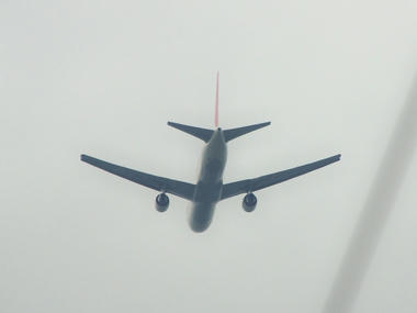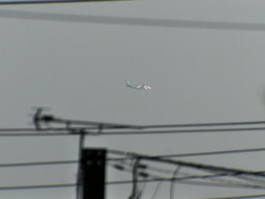 南東の空を低空で通過するヒコーキ。