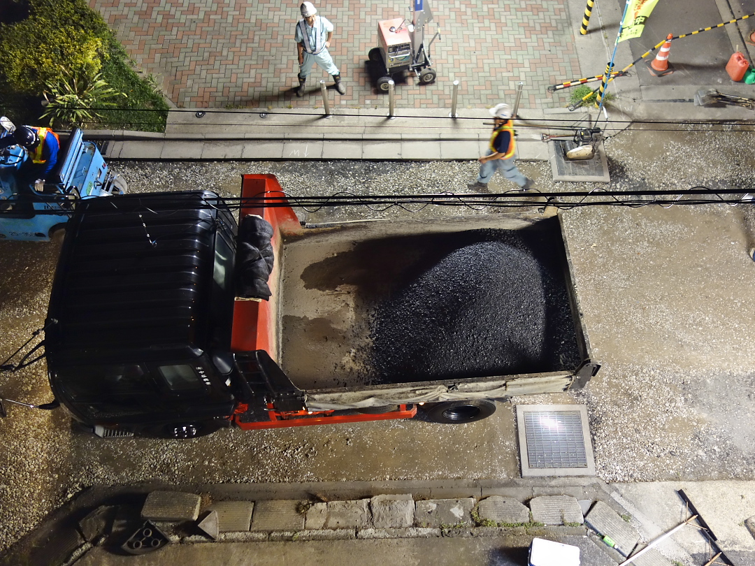 ↑これはTWK屋上から撮ったのだけど、ご覧のとおり真横‥‥‥というか真下で古いアスファルトを全部剥がして地ならしして、新たに舗装し直したわけだから、寝ようとしても頭のすぐ下で工事の音がなりっぱなしだし、振動ももろに伝わってくるし‥‥‥で、こりゃ~眠れないや―――などと思っていたのだけど、気がついたら朝になって工事は終わっていた↓