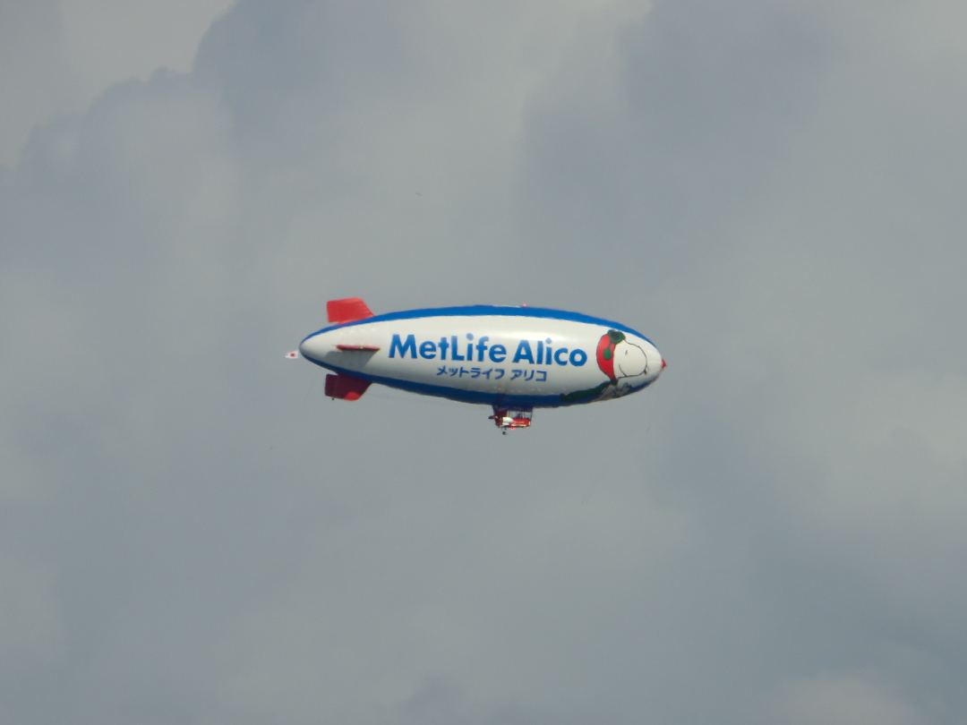 ↑「飛鳥Ⅱ」と「ぱしふぃっくびいなす」が接岸中の横浜大桟橋の上空に、以前も取り上げたことがある「外資系保険会社の宣伝用飛行船」の姿が。