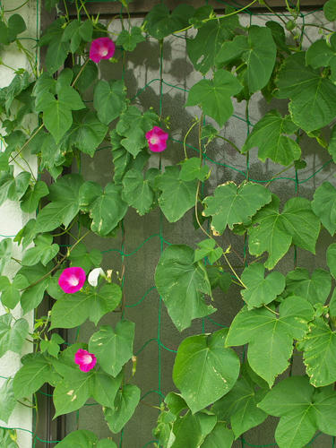 このピンクのやつは「マルバアサガオ」という種類みたい。そういえば葉っぱがアサガオと違って丸い「はあと型♪」してますね‥‥‥って言っても、ふつーのアサガオとごちゃごちゃに混ざっててわかりにくいけど(^^ゞ。
