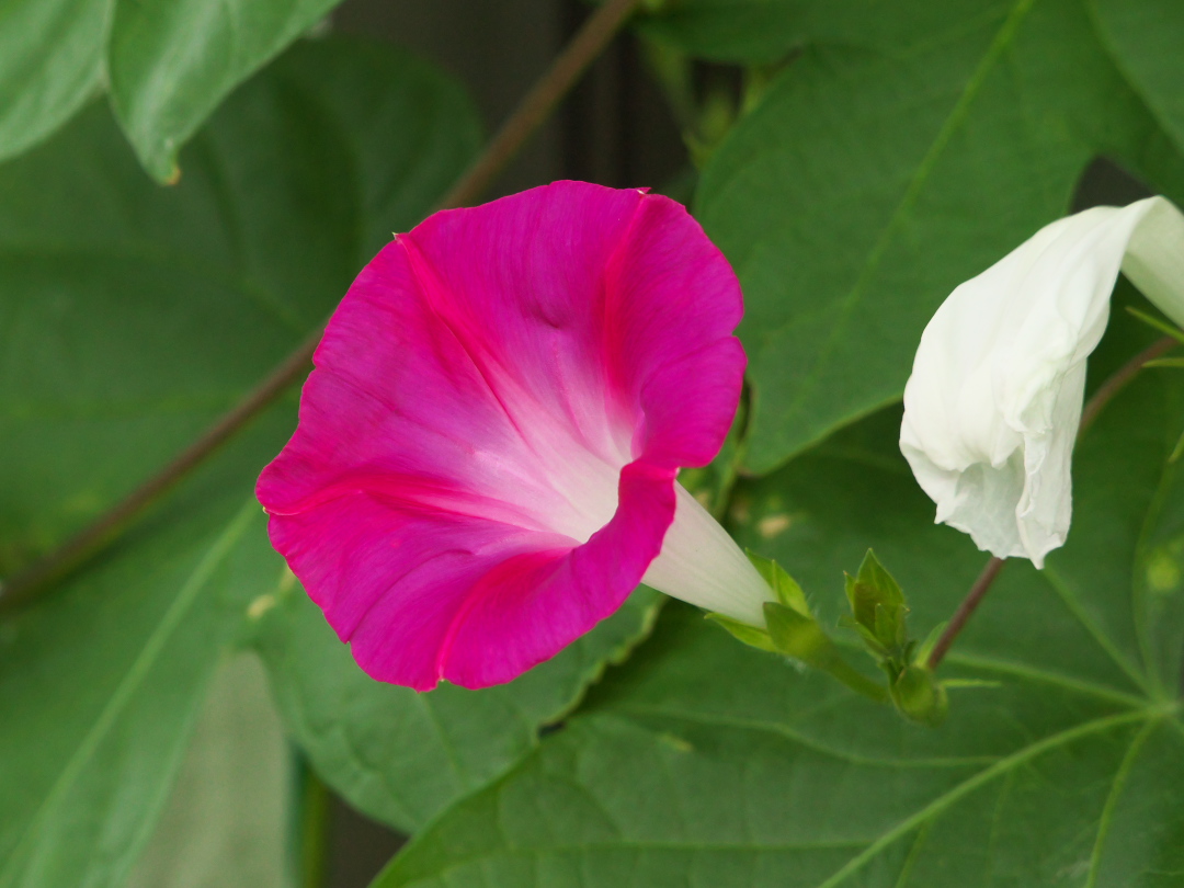 何日か前に先に咲き始めた白いアサガオとは葉っぱの形が違うので、どんな花が咲くのかと思っていたのだけど、こんな鮮やかなショッキングピンクの花でした(^^)v。