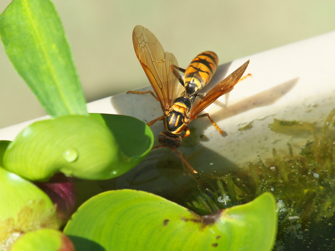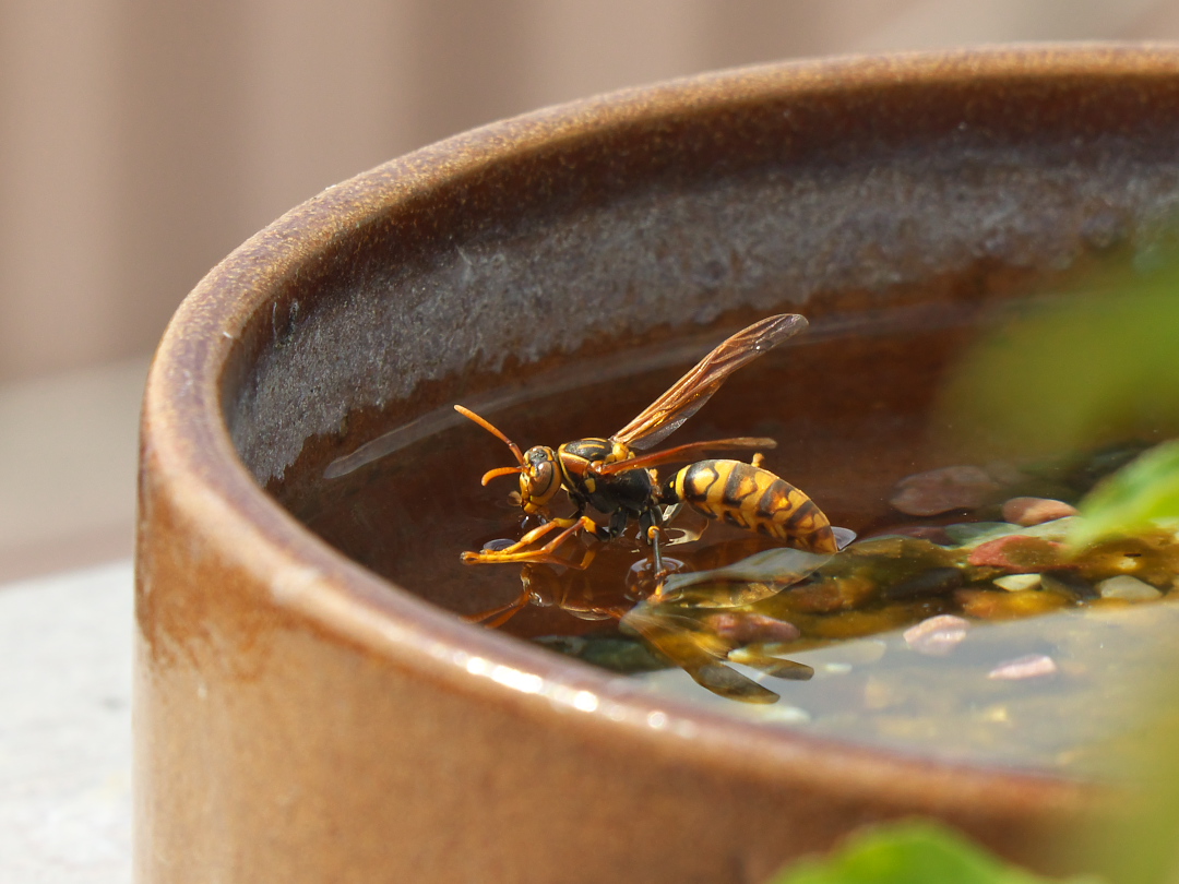 ↑トリさんの水飲み場で水を飲むアシナガバチ(たぶん「キアシナガバチ」だと思う)。
